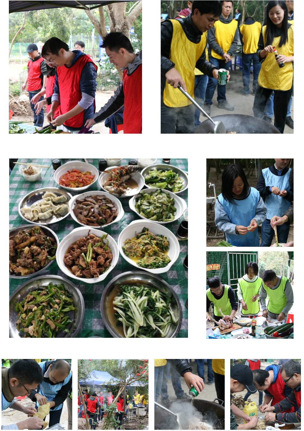 上午交流會(huì)結(jié)束的比較晚,相信大家已經(jīng)饑腸轆轆了,自助中餐野炊考驗(yàn)大家的動(dòng)手能力和默契的能力。團(tuán)隊(duì)被分為紅黃藍(lán)綠四組,每組自行領(lǐng)取食材,自制美味午餐!女洗菜來(lái),男抓雞,一起動(dòng)手生火,做飯等,俗語(yǔ)云:男女搭配干活不累 ! 一頓香噴噴的飯菜就在輕松愜意的氛圍里上桌。